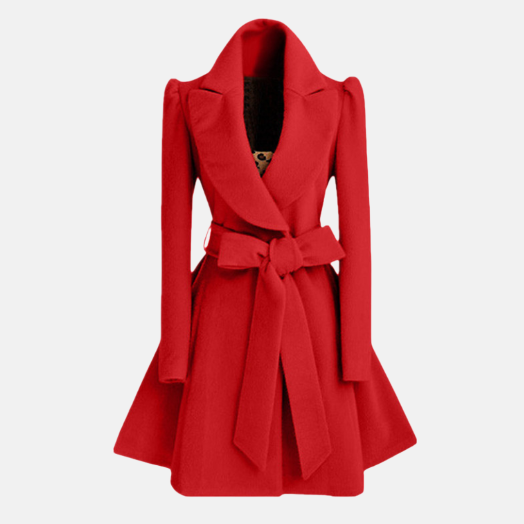 Women’s Coat – Slim Fit Wool Blend – A-Line Skirt – Belted Bow Waist – Wide Collar