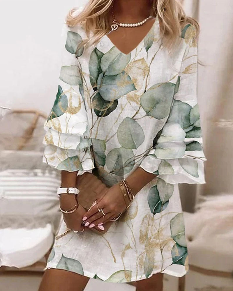 Pleated Neckline Puff Sleeve Knee-Length Dress