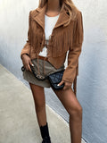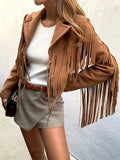 Embrace your inner free spirit with the Women's Suede Jacket - Fringe Detailing - Notched Lapel - Boho Western Style from Elegance-urban.com! This stylish jacket features eye-catching fringe details, a classic notched lapel, and a comfortable silhouette, perfect for adding a touch of boho-western charm to any outfit. Elevate your wardrobe with this statement piece!