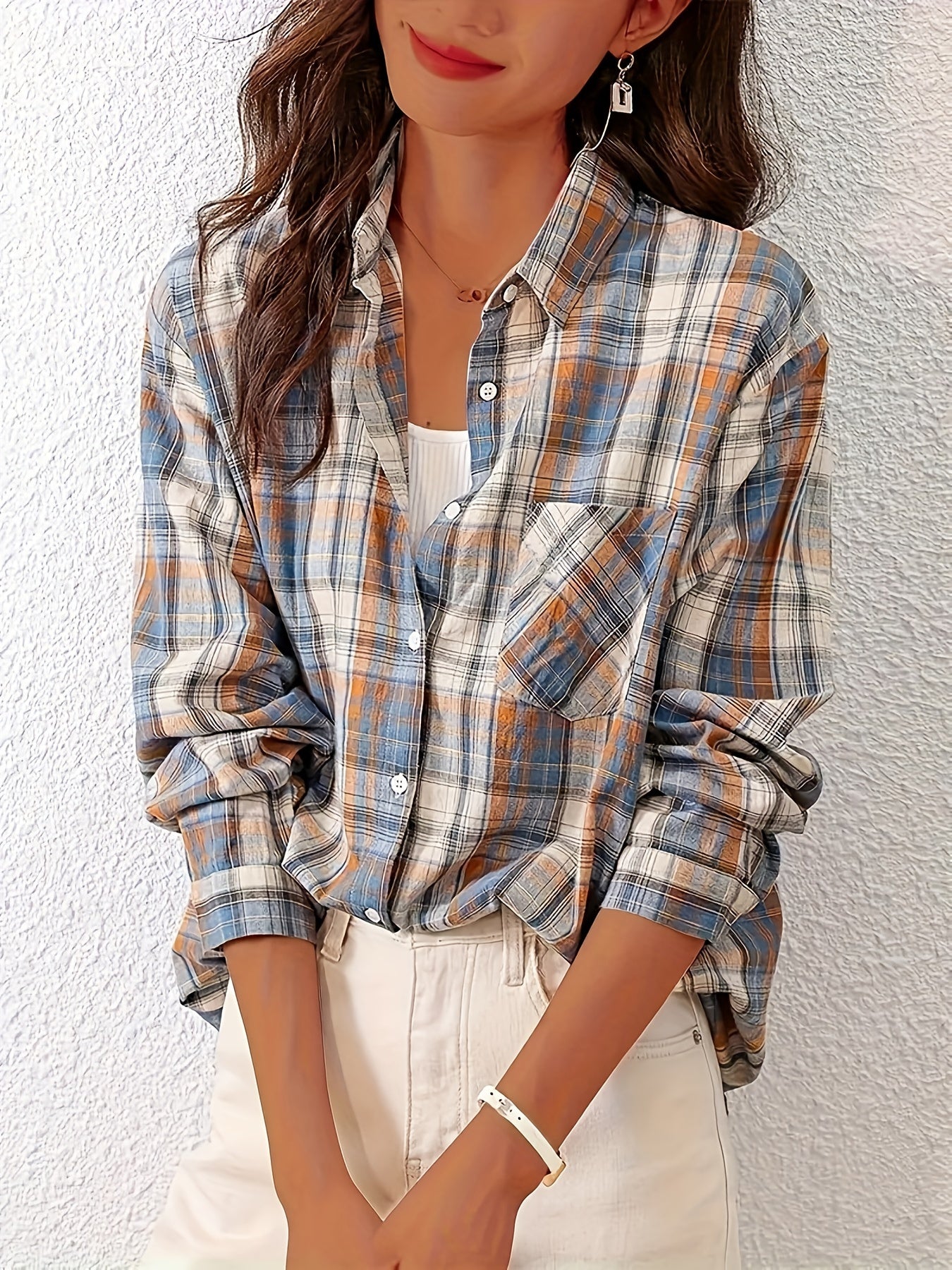 This classic plaid long sleeve blouse for women combines timeless design with everyday comfort. Featuring a lapel collar and button details, this woven polyester shirt is perfect for layering or wearing on its own. Its lightweight yet durable fabric makes it ideal for transitional seasons like spring and fall. Pair it with jeans, trousers, or skirts to create effortlessly chic outfits for any occasion.