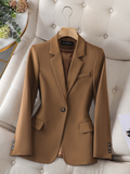 Women's Tailored Blazer - Fitted Silhouette - Single Button - Notched Lapels. This impeccably tailored blazer boasts a flattering fitted silhouette, elegant notched lapels, and a sleek single-button closure. Complete with functional pockets, this blazer is perfect for elevating any outfit.