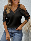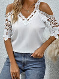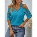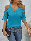 Turn heads with this elegant cold shoulder blouse, featuring delicate contrast lace accents and a flattering V-neck design. The short sleeves offer a breezy feel, while the lace detail adds a sophisticated touch perfect for any occasion. Pair it with jeans for a casual day out or style it with a skirt for a chic evening look. This versatile piece is a must-have addition to your spring and summer wardrobe.