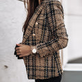 Elevate your wardrobe with our Women's Tweed Blazer - Double-Breasted - Tailored Fit - Textured Check Pattern. This classic blazer features a sophisticated tweed fabric, a flattering tailored fit and elegant metallic buttons, perfect for both professional and casual occasions. The timeless textured check pattern adds visual interest. This blazer is a must-have for the discerning woman.