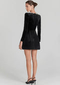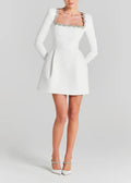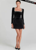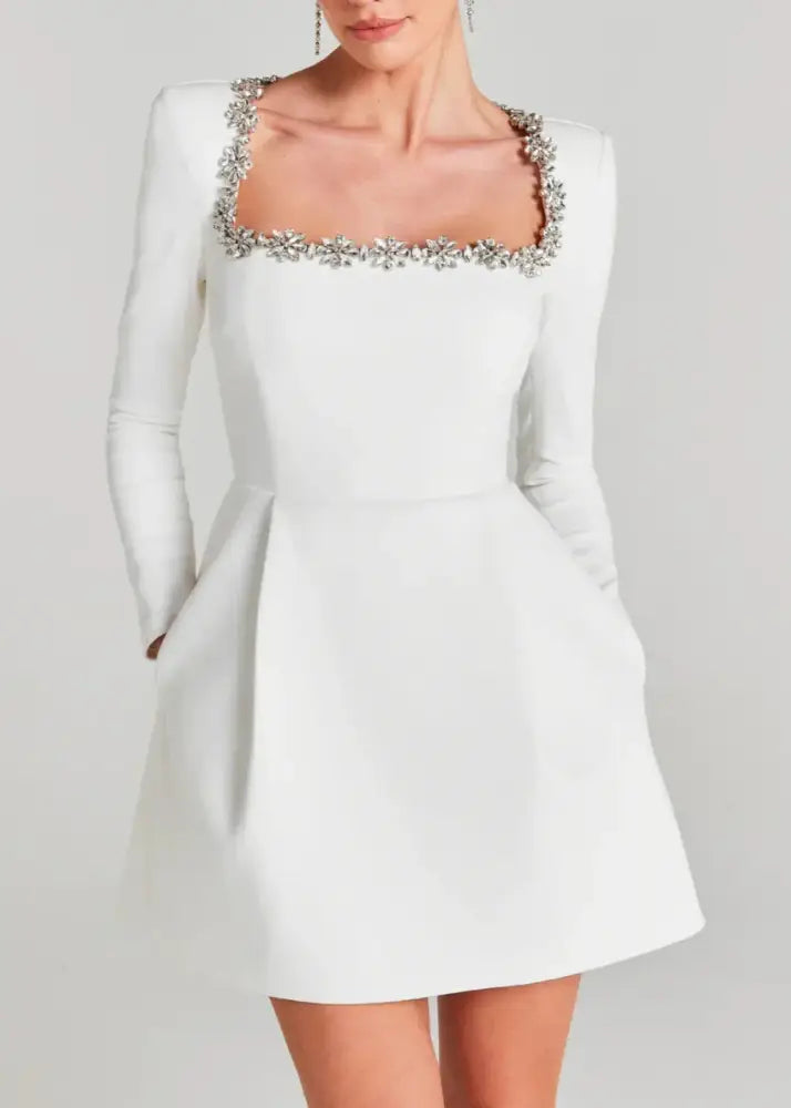 Women's Mini Dress - Fitted Silhouette - Long Sleeve - High Neck Embellished Elegant Wear. This stunning mini dress boasts a flattering fitted design, elegant high neck with embellishments, and long sleeves, perfect for adding a touch of sophisticated glamour to your wardrobe. Ideal for special occasions or a night out.