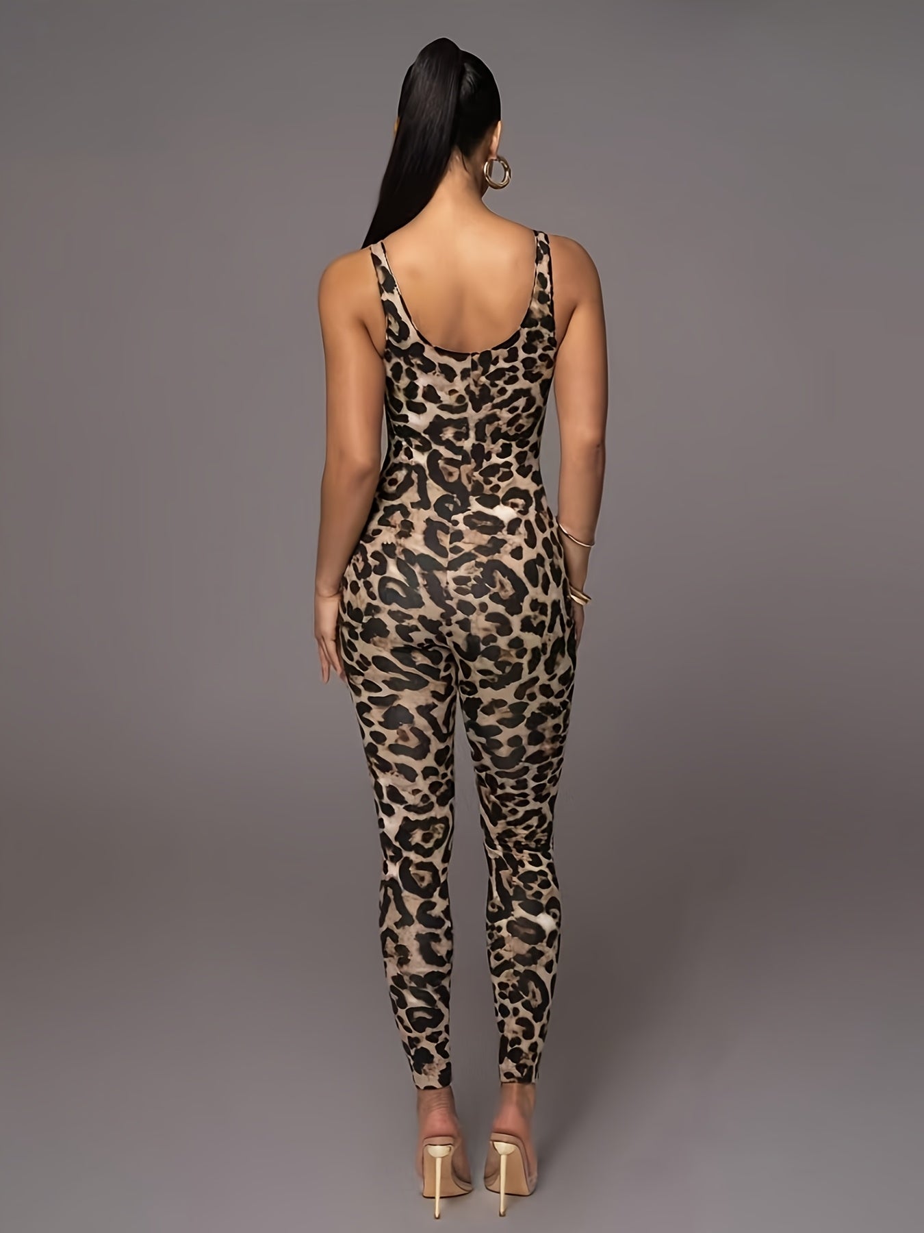 - Design: Leopard print, sleeveless, full-body jumpsuit