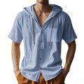 Men’s Hooded Shirt – Relaxed Fit – Short Sleeve – Button-Up Casual Style is the perfect blend of comfort and style. This short-sleeve, button-up shirt, crafted from a breathable fabric, features a relaxed fit and a casual hood with drawstring accents. Ideal for warm weather and casual occasions, it offers a unique twist on a classic design with a practical chest pocket.