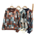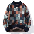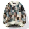 Men’s Pullover Sweater – Relaxed Fit – Wool Knit – Checkerboard Patchwork – Crew Neck