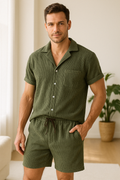 Elevate your relaxation with the Men’s Lounge Set - Waffle-Knit Texture - Short-Sleeve Button-Up Shirt & Drawstring Shorts - Relaxed Fit Breathable Casual Wear from Elegance-urban.com. This casual two-piece set features a comfortable waffle-knit texture, a short-sleeve button-up shirt with a notched lapel and chest pocket, and relaxed-fit drawstring shorts with side pockets. Perfect for lounging or casual outings.