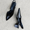 Step out in style with our Women’s Slingback Heels – Croc-Embossed Leather – Pointed Toe – Block Heel. These sophisticated heels feature a pointed toe and a secure slingback strap, crafted from luxurious croc-embossed PU leather, finished with a stable block heel. Perfect for elevating any outfit.