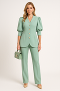 - Design: Structured fit with lantern sleeves and straight-leg trousers