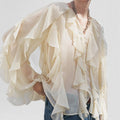 Effortlessly chic Women’s Blouse – V-Neck – Loose Fit – Long Sleeve – Sheer Fabric – Ruffle Front by Elegance-Urban. This stylish blouse features a flattering V-neck, long sleeves, and a playful ruffle front design in a sheer, lightweight fabric. Perfect for dressing up or down!