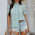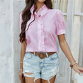 Elevate your style with the Women’s Button-Up Blouse – Tailored Fit – Ruffle Trim – Puff Short Sleeve Breathable from Elegance-Urban. This breathable and stylish blouse features a tailored fit, a charming ruffle trim, and fashionable puff short sleeves, perfect for any occasion.