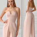 - Design: Strapless with wide leg and front slits