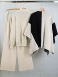 Women’s Knitted Three-Piece Set – Relaxed Fit – Mock Neck – Wide-Leg Pants – Cape Layer