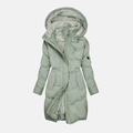 Women’s Long Puffer Coat – Quilted Insulated – Plush Hood – Adjustable Waist – Zip Front