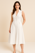Women's Midi Dress – V-Neck Button Front – Sleeveless Flared Fit – Lightweight Fabric. This elegant midi dress features a flattering V-neckline, a charming button-front design, and a sleeveless, flared fit. Crafted from a lightweight, breathable fabric, it's perfect for staying cool and stylish.