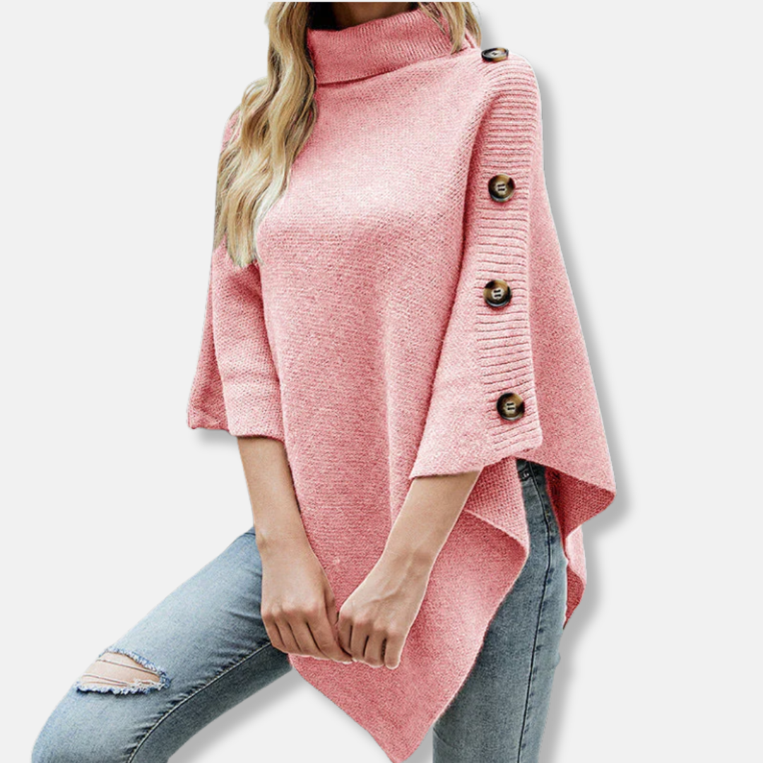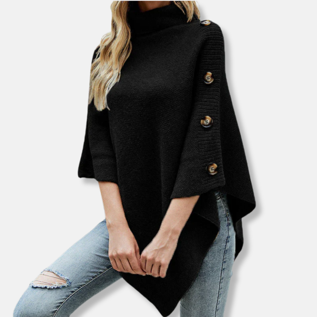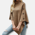 Elevate your style with the Elegance-Urban Women's Poncho Top – Ribbed Knit. This oversized fit poncho boasts a high neck, asymmetrical hem, and chic ribbed texture, perfect for adding a touch of relaxed sophistication to any outfit. The unique button details enhance its contemporary appeal.