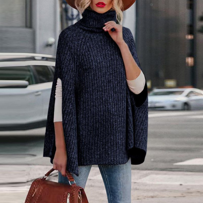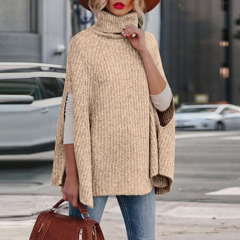 Women’s Sweater Cape – Loose Fit – Knit Wool Blend – High Neck – Arm Slits