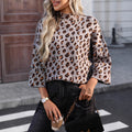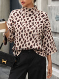 Women’s Sweater – Loose Fit Knit – High Neck – Leopard Print – 3/4 Sleeve Casual