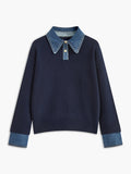Women's Sweater – Relaxed Fit Knit with Denim Collar and Cuffs for a chic layered look. This cozy knit sweater offers comfort and style. Effortlessly elevate your wardrobe with this versatile piece, perfect for any casual occasion. It is relaxed fit and denim details.