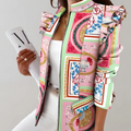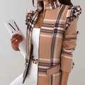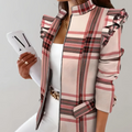 Women’s Tailored Jacket – Plaid Pattern – Ruffle Shoulder – Stand Collar – Hip Length