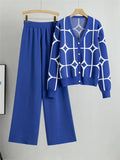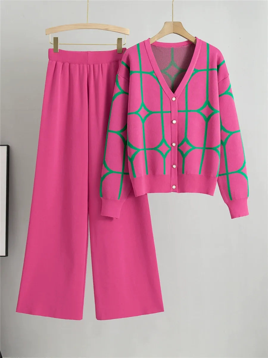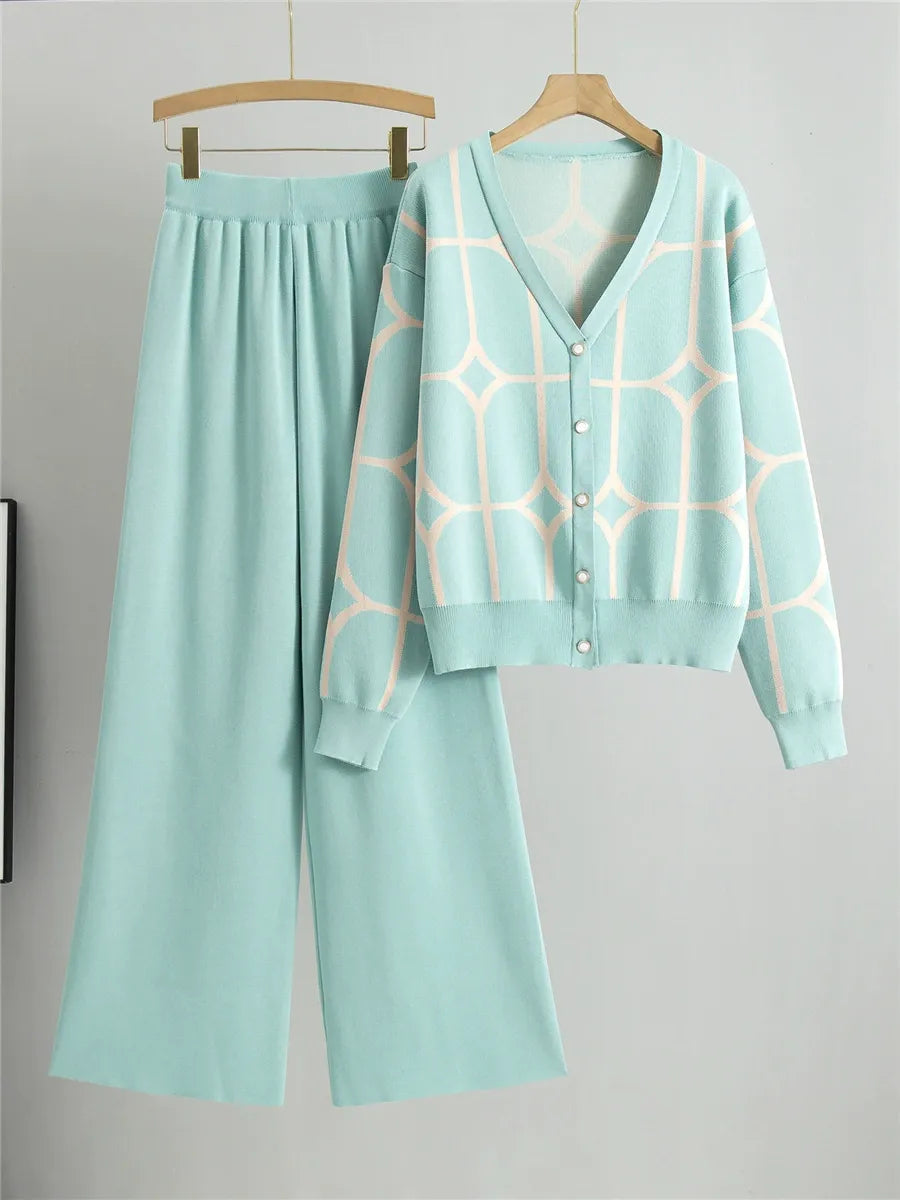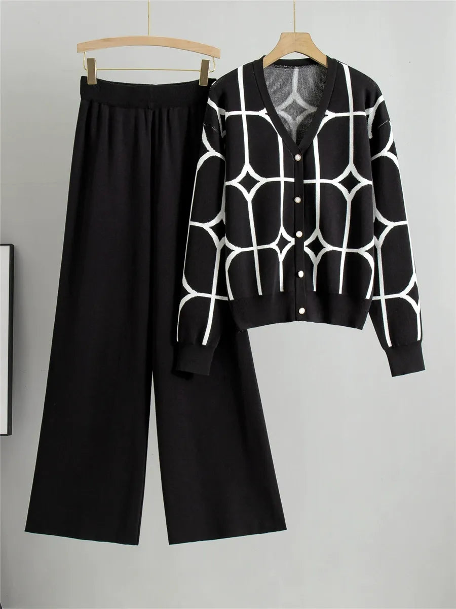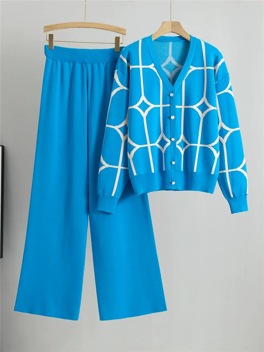 Women’s Two-Piece Knit Set – V-Neck Cardigan with Geometric Pattern – Wide-Leg Pants