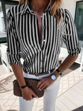Elegance-Urban presents the Women's Blouse - Striped Button-Up - Tailored Fit - Long Sleeve Versatile Wear. This classic striped blouse features a flattering tailored fit, long sleeves with roll-up option, and a button-up design perfect for versatile styling. A wardrobe essential for chic and sophisticated looks!