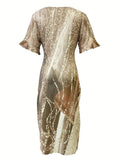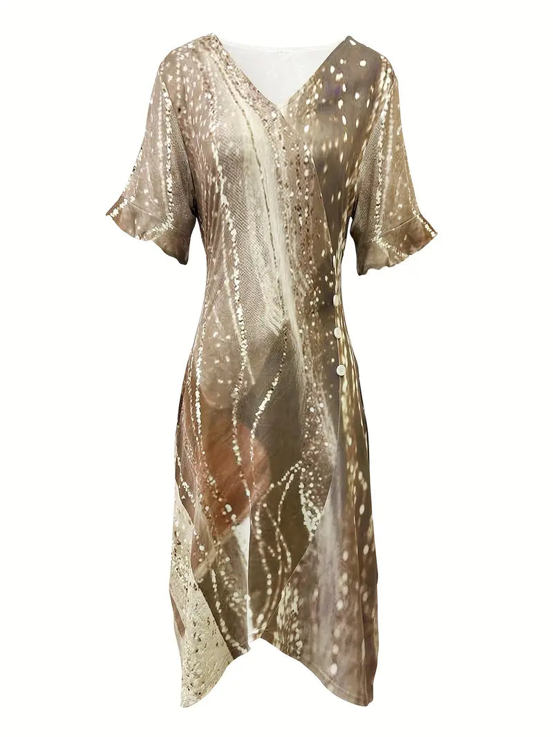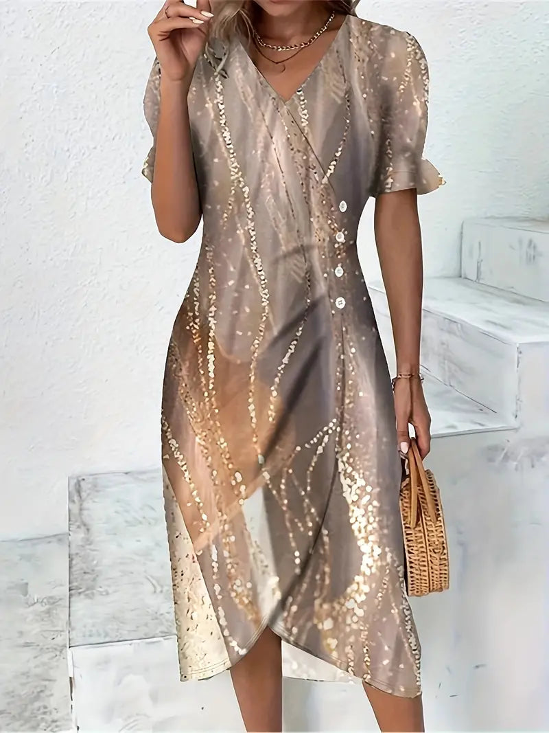 Women's Elegant Dress - V-Neck Short Sleeve - Fitted Waist - Floral Print. Radiate charm in this floral V-neck dress. Features a fitted waist and delicate short sleeves. Perfect for adding a touch of elegance to any occasion.