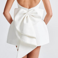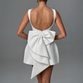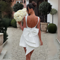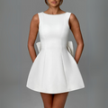 Elegance meets modern chic in this Women's Mini Dress - Sleeveless A-Line - Pearl Embellished Neckline - Bow Back by Elegance-Urban. This elegant mini dress features a flattering A-line silhouette, a sophisticated pearl-embellished neckline, and a charming bow back detail, perfect for making a statement.