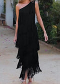 Step out in style with the Women's Fringe Dress - One-Shoulder Asymmetric Design - Layered Detailing - Elegant Evening Wear by Elegance-Urban. This dress features an asymmetrical, one-shoulder design, and flowing layered fringe creating a dynamic and sophisticated silhouette perfect for evening events. A head turning statement piece!