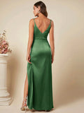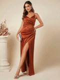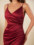 Elevate your evening with the Women's Satin Slip Dress - Spaghetti Straps - Draped Neckline - Ruched Backless Gown by Elegance-Urban. This elegant, floor-length satin dress features a draped neckline, delicate spaghetti straps, a figure-flattering ruched detail, and a alluring backless design. Perfect for special occasions, its high slit adds drama and movement.