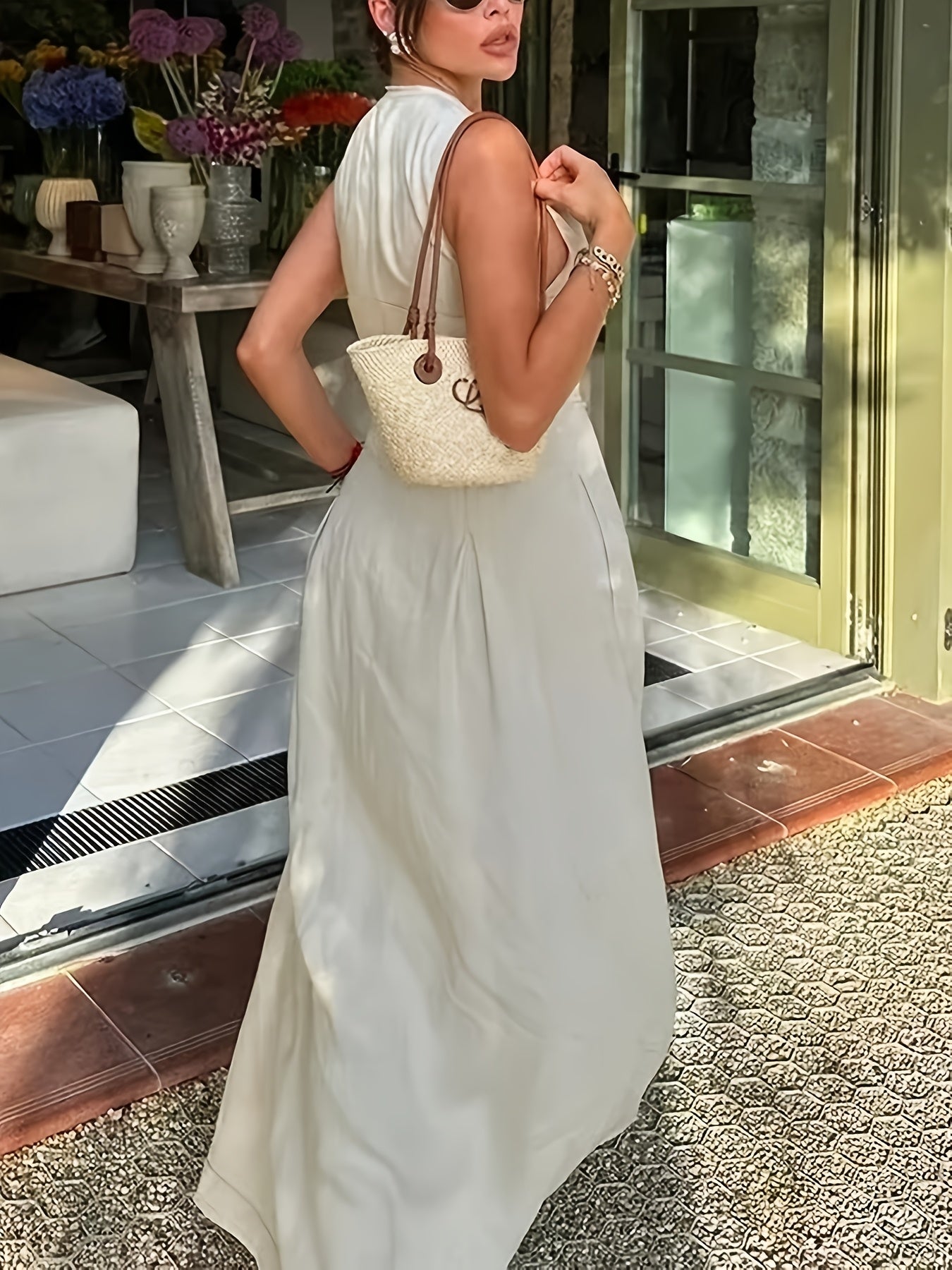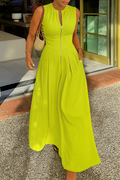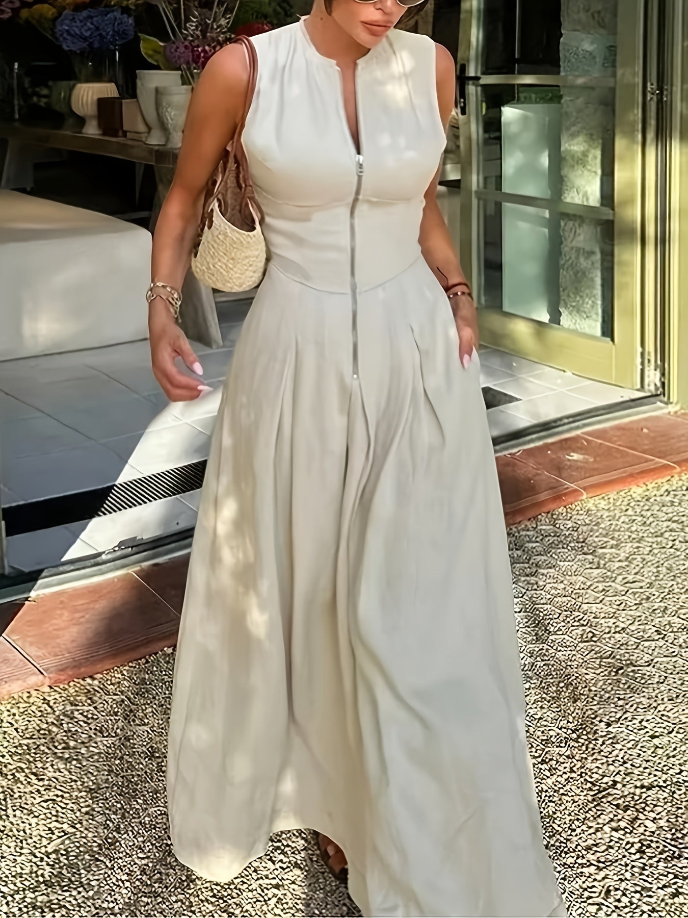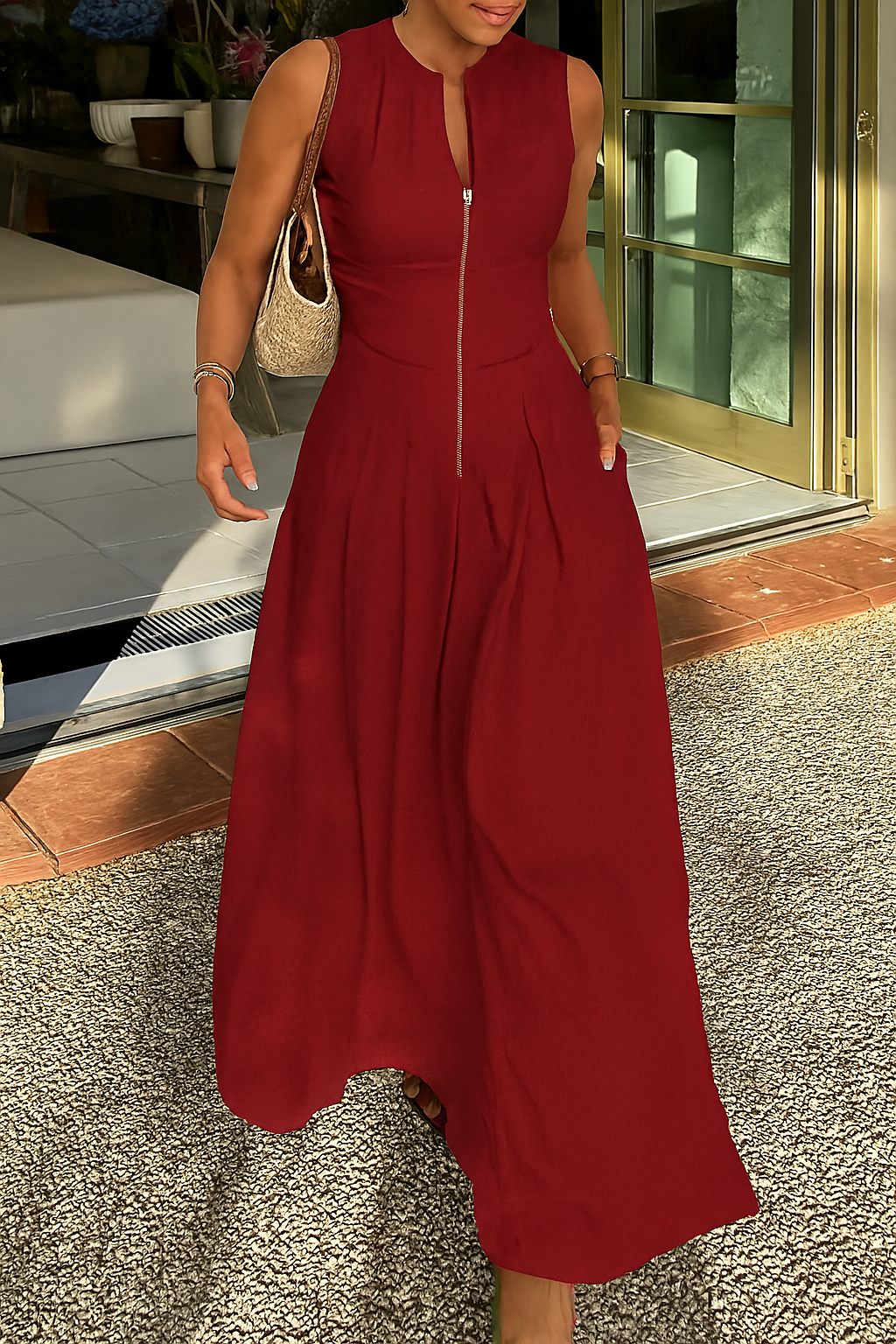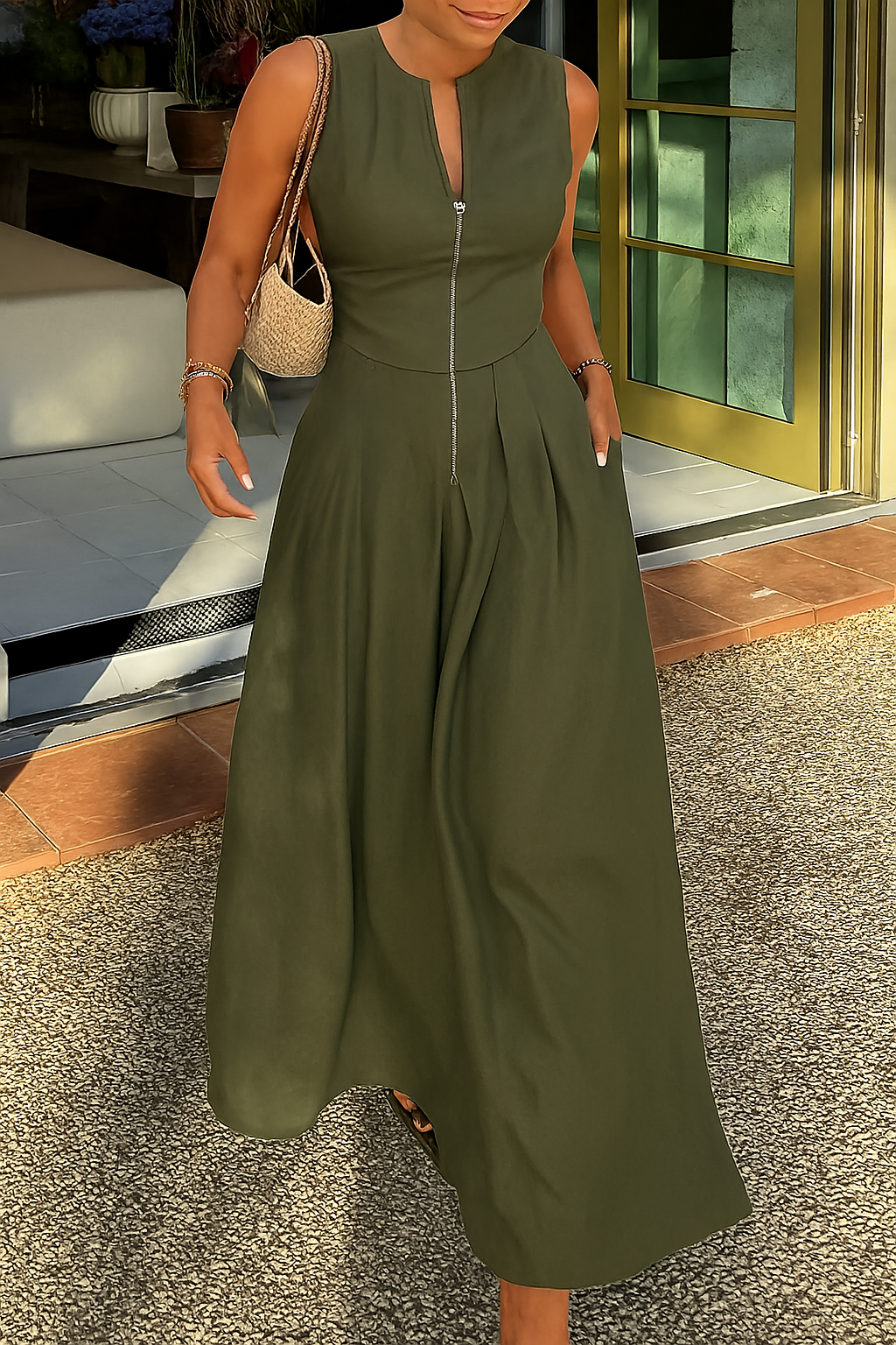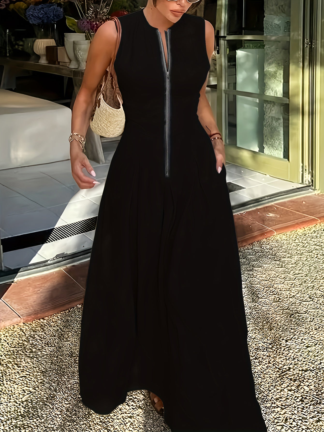Elegance meets comfort in this Women's Sleeveless Maxi Dress - Deep V-Neck - Front Zipper - Flowy Elegant Fit. This stylish dress features a flattering deep V-neck, a convenient front zipper, and a relaxed, flowy silhouette. Perfect for effortless elegance on any occasion.