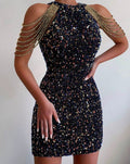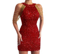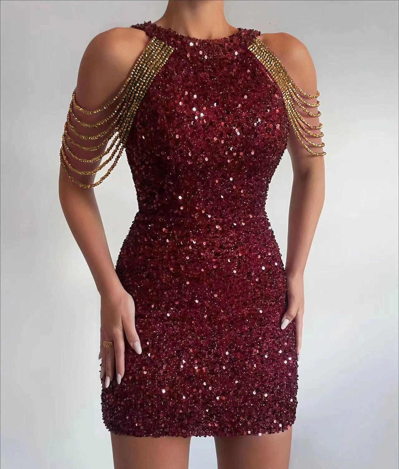 Shine at your next event in our Women's Sleeveless Party Dress - Fitted Silhouette - Sequined - Elegant Drape Detail by Elegance-Urban. This fitted, sequined mini dress features elegant drape details, creating a stunning and sophisticated look perfect for a night out.