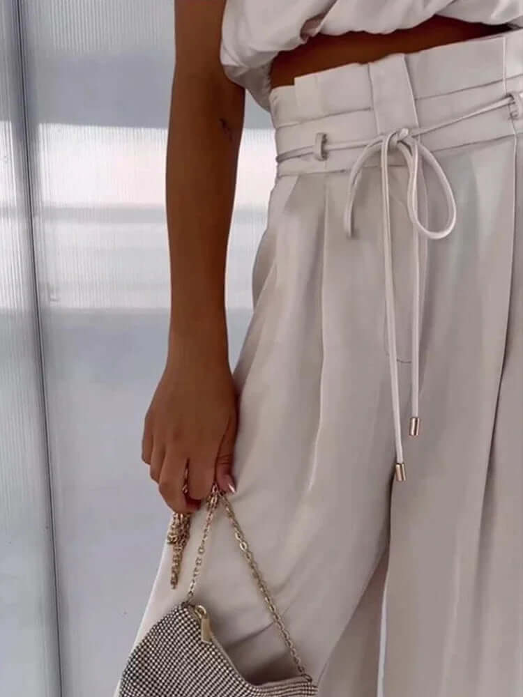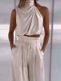 Elevate your style with this Women's Two-Piece Set - Halter Neck Cropped Top - High-Waisted Wide-Leg Pants from Elegance-Urban. This chic set features a flattering halter neck cropped top and comfortable high-waisted, wide-leg pants with a drawstring closure. Perfect for versatile styling and occasions.